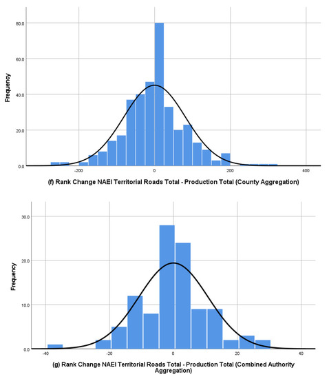 Figure 6 shows the distribution of emissions across the local authorities using both methods for all transport emissions (a and b) and then per capita (c and d). The difference in ranking when applying the two methodologies, as explained in Section 2, for total emissions is shown in Figure 6e. Then, the smallest units were aggregated so that counties were used rather than their constituent districts (Figure 6f) using the same rank difference approach. Then, metropolitan unitary authorities were aggregated to combined authorities (Figure 6g).