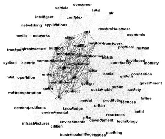As smart cities are known as urban environments where the ITC system supports them, Piro et al. (2014) [40] argued that the use of JTIs can provide the urban community with advanced and innovative services and points to the importance of developing a platform for the ITC service. Thus, this model should have the ability to span all available wireless technologies and be the start of a new business, as well as demonstrate the real purpose and importance of creating intelligent environments. After analyzing the importance of the terms and their frequency, Figure 4 was developed, which presents a graph of interdependence for the terms. As can be seen in Figure 4, all terms have a direct connection to each other, but those that present a greater interdependence are support, cities, net, network, quality, technologies, communications, communication, information, digital, data, energy, life, environment, smart, connect, city, and design.