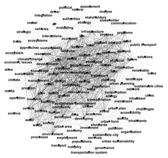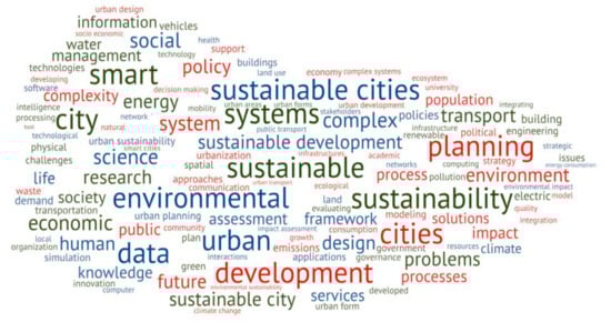 As seen in Figure 5, there are several terms in the word cloud that present a similar frequency, such as systems, planning, environmental, sustainable, urban, development, cities, smart, policy, data, economic, human, energy, and environment. Based on these results, it is possible to analyze how the authors present the main terms regarding the building of a sustainable city. Bond and Morrison-Saunders (2011) [56] presented sustainable development as the main goal in the field of expansion of sustainability evaluation, arguing that sustainability evaluation practices are based on particular frameworks of political controversies, while one of its main goals is to help deliberation on these controversies, creating a movement toward a new sustainability thinking and encompassing all these different ideas.