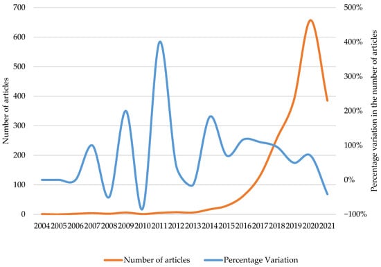 Comparison between the number of articles published and their variation percentage (2004–May 2021).