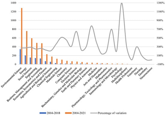 In the 2004–2018 period, the number of disciplines framed in this line of research was 24, since there were no investigations in the categories of Health Professions, Dentistry and Neuroscience. Among the other categories that registered publications, Environmental Science with 345 investigations, Energy with 202, Social Science with 153, Engineering with 141 and Business, Management and Accounting with 132 stand out due to their higher values when compared with the rest of the disciplines. In total, these five disciplines represented 78.03% of the total sample and encompassed 973 publications. In the entire period, 2004–May 2021, these aforementioned five categories were still the main disciplines, with a 76.51% representation of the total sample. Thus, Environmental Science has registered 1281 publications to date, Energy 756, Social Science 592, Engineering 488 and Business, Management and Accounting 479. Additionally, in relation to the three thematic areas that did not register any research in the period above, they begin to gain popularity, with four publications in Health Professions and one publication in Dentistry and Neuroscience. Finally, all the categories have positive variation percentages. Psychology is worth mentioning for having the highest value (1300%), passing from 1 investigation in 2004 to 2018 to 14 publications in the full period (2004–May 2021). This discipline is followed by Physics and Astronomy with a 775% variation and Decision Sciences with 650%.