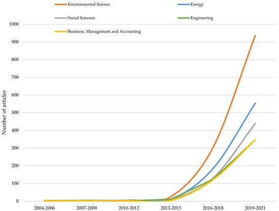 The most representative discipline, Environmental Science, registered its first article in 2004, and from 2011 onwards, publications have been recorded annually until reaching a total of 265 articles in 2021. Environmental Science brought together a total of 1281 investigations, which represents 27% of the sample. The second category, Energy, registered its first publication in 2006, and since 2012, it has been part of annual investigations. In the last year analyzed (2021), it has had 165 publications, and in total, it has conducted 756 investigations, which represents 16% of the total scientific production. The third position is occupied by Social Science. This thematic area registered an investigation in 2004 and stands out in 2011 for being the year in which publications begin to be framed annually. In total, it represents 13% of the sample and encompasses 592 publications.