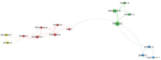 The second cluster, in red, includes Idiano D’Adamo, Piergiuseppe Morone, Pasquale Marcello Falcone, Luana Ladu, Enrica Imbert, and Francesco Ferella. This collaboration group stands out for being the widest and for having authors of Italian and German nationality. Furthermore, based on this international collaboration between Italian and German authors, research is carried out for both countries [].