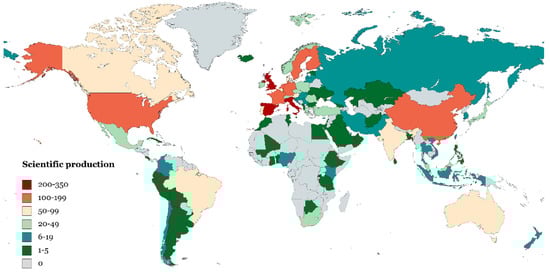 Figure 5 represents the world map with the countries that have contributed to scientific production from 2004 to the present. This map provides information about the countries that occupy an advantageous position in scientific production and those that still have research to do.