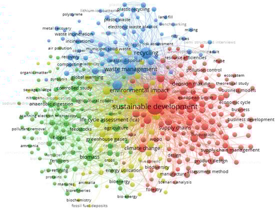 Finally, the blue cluster to the right of the figure includes Alexandra Purkus, Erik Gawel and Nina Hagemann. All three authors are German, and therefore their research on BE and CE within the sustainability framework focuses on their country, Germany. Some of their articles are “Towards a sustainable innovation system for the German wood-based bioeconomy: Implications for policy design”, which reviews the role of policies in supporting innovation systems, particularly in the case of the German wood-based bioeconomy, and “Possible futures towards a wood-based bioeconomy: A Scenario Analysis for Germany”, which focuses on identifying the wood-based bioeconomy as an alternative that has the potential to be developed [,].