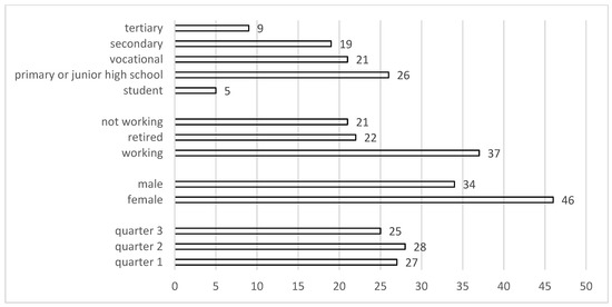• Qualitative data—these are the primary data collected from in–depth interviews with residents of the pilot area, all of whom were socially excluded or at risk of exclusion, including municipal debtors. A total of 80 interviews were conducted between 14 May and 23 June 2015. The interviews lasted from 30 min to two hours, depending on the informational content of the interview and the respondent’s communicativeness (the interview time was clearly controlled by the moderator, not the respondent). Recruitment for the interviews was carried out using the random route method. Different starting addresses were used in each of the three examined quarters. As a result, the addresses of the respondents were scattered throughout the area covered by the study. Additionally, the snowball method was used to identify groups of respondents who tend to be more difficult to find (debtors, leaders). To recruit the homeless, street workers from the Municipal Social Welfare Centre and shelters for the homeless were consulted. The research process was smooth, as it was relatively easy to persuade the respondents to participate in the interviews, in part because they were remunerated for the time they spent in the interviews. The vast majority of the interviews took place at the respondents’ homes, which allowed for additional observations (e.g., about the technical condition of the apartment, and about the people who were living with the respondent). In line with the methodological assumptions, it aimed to have a sample of respondents that was composed of both even representations of the three pilot area quarters, and individuals with different demographic characteristics to ensure that the respondents’ stories, experiences, and opinions would be as diverse as possible. As a result, the interviewees were drawn from all three quarters of the pilot area. There were more female than male respondents, and the interviews were conducted with representatives of all age groups. While some of the respondents were working (including under specific contracts and mandates), others were not employed or were receiving a pension or retirement benefits. While the largest group of respondents had completed their education at the primary school level, significant shares also had vocational or secondary education (see Figure 3).