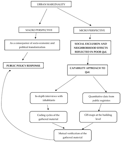 The existence of socially disadvantaged neighborhoods is to a large degree the result of overall social inequalities in society [44] and unequal access to different community assets [40], which are multiplied by the specific local conditions. Poor neighborhoods or more generally urban marginality can be analyzed both from an individual (micro) and socio–economic and political (macro) perspective.