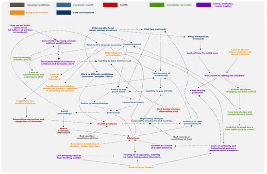 As a consequence, when analyzing the individual life trajectories of the 80 respondents, various mixtures of negative social phenomena were identified that could be seen as making up the “web of social exclusion” that entwined them, along many other coexisting and complicated mechanisms. A draft of such a web based on the interviews was developed in the first step, and was then verified with the quantitative data obtained from the registries. To create this web, maps at the building level were drawn up based on the quantitative data (Supplementary Materials). The final version of the web is presented in a synthetic way in the Figure 5.