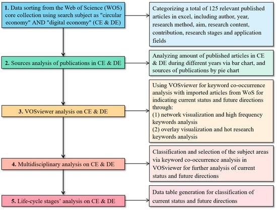 The structure of the research method, which is shown in Figure 1, encompasses five stages: (1) determining the subject of the study, retrieving CE and DE articles, collecting and organizing relevant data; (2) using bar charts and pie charts to record sources of CE and DE publications; (3) performing keyword co-existing analysis through VOSviewer, including network visualization, high-frequency keywords, overlays visualization, and hot research keywords; (4) performing multidisciplinary research, according to the classification of “research areas” in the WoS database via selecting subject areas and conducting keyword co-existing analysis; (5) carrying out analysis on life cycle stages and application areas in CE and DE.