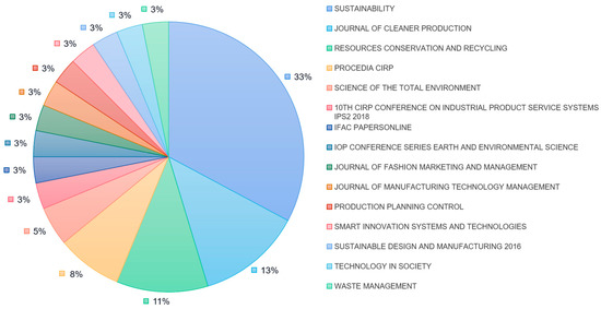 As shown in Figure 2, the number of articles under the topic of CE & DE has been increasing year by year from four articles in 2016 to 55 articles in 2020, and it is predicted that this trend will also develop in the future. The sources of publications in CE & DE are shown in Figure 3, of which the minimum number of publication records is two, and the leading source among 15 sources is SUSTAINABILITY with 33% of all the published articles, followed by JORNAL OF CLEANER PRODUCTION (13%), RESOURCES CONSERVATION AND RECYCLING (11%), PROCEDIA CIRP (8%), and SCIENCE OF THE TOTAL ENVIRONMENT (5%).