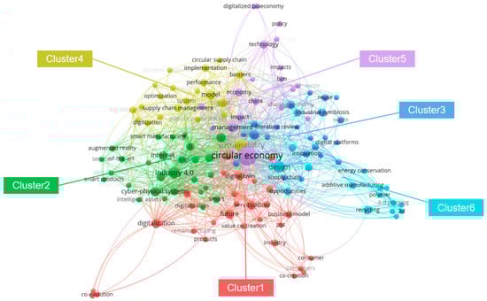 In network visualization, there are text labels, circles, connections, and color areas. By default, items are represented by labels and circles. The size of the item label and circle determines the weight of the item, and the position distance or (and) connection strength between the two items represents the strength of their affinity [49]. At the same time, different color regions represent different clusters. As shown in Figure 4, all terms are divided into six different color areas generated from the VOSviewer, representing six different types of clusters. Cluster 1 is mainly related to business, including business mode, servitization, digitalization, value co-creation, and consumer. Cluster 2 is associated with technology, such as digital technologies, IoT, smart manufacturing, AR, and VR. Cluster 3 mainly includes industrial symbiosis and sharing economy, as well as innovation and framework. Cluster 4 is focused on sustainability, with its strategy, supply chain management, and model. Cluster 5 is correlated to management in economic and technical aspects. Cluster 6 is aimed at life cycle management via design, recycling, and waste management.
