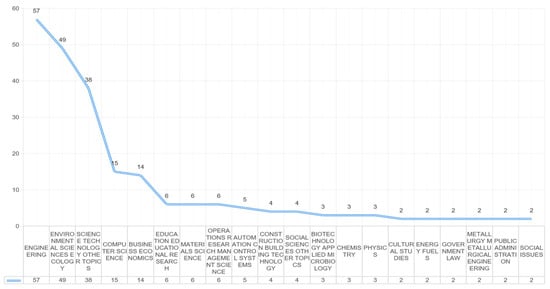 According to the classification of “research areas” in the WoS database, published articles are divided into 20 different subject areas, where the minimum number of records is 2, as shown in Figure 6. Among these subject areas, the most articles are in the field of ENGINEERING, followed by ENVIRONMENTAL SCIENCES ECOLOGY, and SCIENCE TECHNOLOGY OTHER TOPICS. The articles in each subject area were imported into VOSviewer for co-occurrence analysis. However, only seven subject areas, i.e., ENGINEERING, ENVIRONMENTAL SCIENCES ECOLOGY, SCIENCE TECHNOLOGY OTHER TOPICS, COMPUTER SCIENCE, BUSINESS ECONOMICS, MATERIALS SCIENCE, and OPERATIONS RESEARCH MANAGEMENT SCIENCE, can form effective keyword co-occurrence; as such, this study selects the seven subject areas for further investigation.