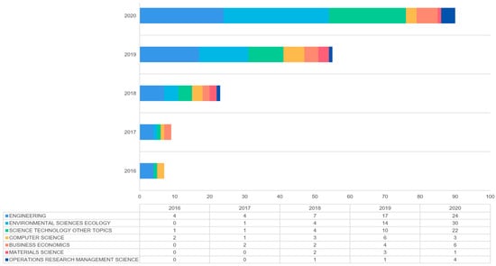 Figure 7 shows the above-mentioned seven subject areas that can form effective keyword co-occurrences, and the article publication status, between 2016 and 2020. It can be seen that the field of ENGINEERING has the most publications and maintains the highest development trend. The number of publications ranked second is ENVIRONMENTAL SCIENCES ECOLOGY, with the first article was published in 2017, and the number of publications obtained in 2020 is the most in seven subject areas. MATERIALS SCIENCE and OPERATIONS RESEARCH MANAGEMENT SCIENCE began to develop gradually in 2018, with the fewest publications. The next step is to explore articles in the seven subject areas to reveal the status of multidisciplinary research and identify gaps and trends in the various disciplines.