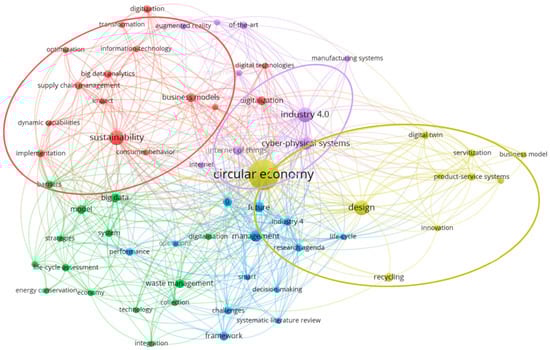 The articles in the ENGINEERING subject areas under the topic CE & DE in WoS have been imported into VOSviewer to generate keyword co-occurrence terminology. As shown in Figure 8, the relationship with the topic CE & DE is more closely related to CE, sustainability, design, I4.0, and cyber-physical systems, which are mainly distributed in three regions, i.e., yellow, purple, and red. The following three areas are summarized as CE and Design, I4.0 and Cyber-physical systems, and Sustainability.