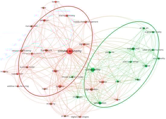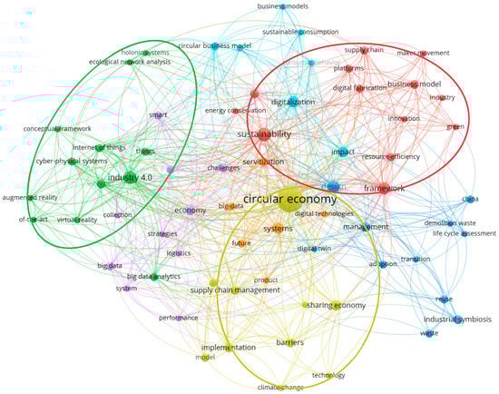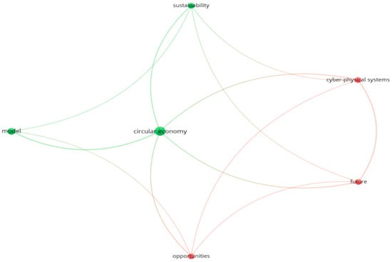 In the green area, as shown in Figure 9, the keywords to establish a closer relationship with “I4.0” are mainly focused on IoT, cyber-physical systems, and VR. Digital technology is an indispensable part of the development of I4.0. Enterprises are introducing digital technologies such as the IoT, VR, and intelligent robots to facilitate the transition to digital enterprises. These include auto parts remanufacturing, improved waste management, harsh environments, and WEEE removal. The current implementation of the IoT loop strategy primarily supports two phases of use, namely, use efficiency and product life cycle extension [82]. The IoT has been used to explore the remanufacturing process of automotive components aiming at extending products’ life [83]. Applying robotics to waste management can reduce people’s heavy physical classification and free them from a work area that affects health, e.g., noise, dust, pollutants, etc.; although there are selected limitations for the efficient application of robotics, such as specific materials and specific technical limitations [56]. VR technology enables companies to improve the ability to recycle valuable components during WEEE removal and improve material repair to improve their circularity [72]. Applying I4.0 technology throughout a product’s life cycle, digitization has made a positive contribution to environmental sustainability by improving resource and information efficiency. However, there is also a negative environmental burden due to the increased consumption of resources and energy, as well as the waste and emissions resulting from the manufacture, use, and disposal of hardware [84].