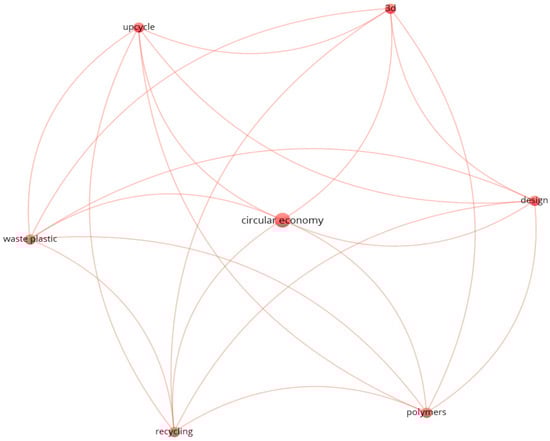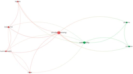 In the field of BUSINESS ECONOMICS in CE & DE, there are a total of eight keyword co-occurrences, as shown in Figure 12. The keywords with higher weighting are “CE” and “sustainability”.