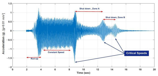 The actual values of the critical rotation speeds are presented a little later in the text, but it is clear here, Figure 2, that critical speeds have been reached by consideration of the acceleration at a point measured on a rotation object during shut-down and run-up. The constant speed RPM is slightly above the critical speed encountered during run-up and is highlighted during Shut down, Zone A. Indeed, this example illustrates a possible increase in transient acceleration during shut down periods. Note that vibration acceleration is shown here and throughout in terms of g = 9.807 m/s2 since this quantity is commonly used by test engineers in machine diagnostics.