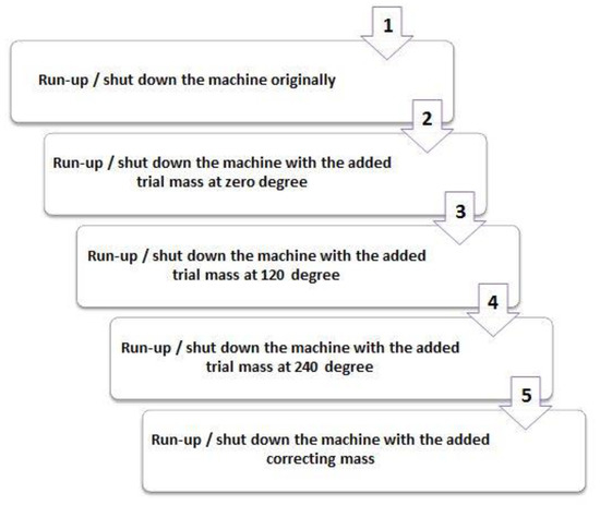 Most of the conventional methods in the field of condition monitoring use methodical steps for determining any slightly unbalanced element to prevent further malfunctions. However, to achieve the best performance of any device and to keep it safe from experiencing damaging vibration, balancing methods are placed on a high level of importance. Innovations and an increase in effectiveness can thus arise; an example of these are outlined within these studies [4,5,6,7]. The standard methods such as vector balancing method and the Four-Run balancing method are widely used in industrial cases. Some of these methods require additional sensors like tachometers for calculations.