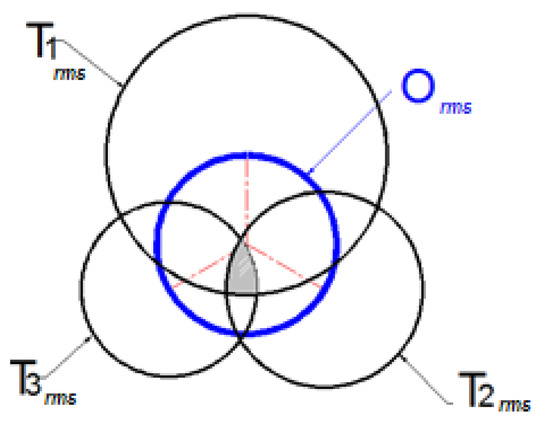 Schematic of drawn circles from vibration or acoustic response assessment. See text for description and explanation of various circles. The final reference point is located at the center of the grey shaded area.
