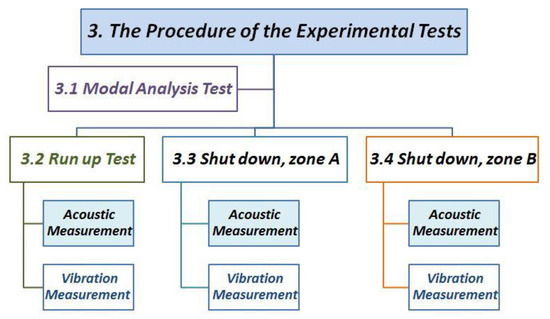 The experimental test procedure, from vibration modal analysis test to the three testing stages, run-up, shut-down Zone A and shut-down zone B.