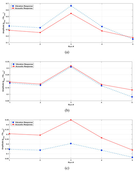 Comparison of rms vibration and acoustic response behavior at all stages: (a) run-up, (b) shut-down zone A, and (c) shut-down zone B, given by balancing the rotating object case study, Figure 5.