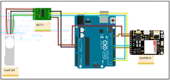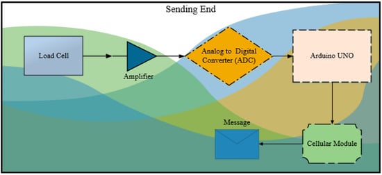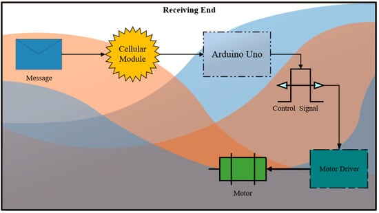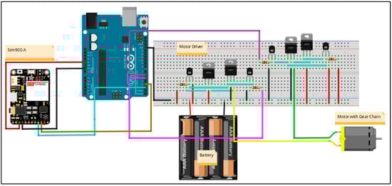 The tele-weight haptic device prototype created for this research is divided into two portions. For the sake of simplicity, one side is labeled the sending end and the other side the receiving end. The circuitry at the sending end side (Figure 3) comprises a programmed set of Arduino family device, an HX711 amplifier chip, and a Global System for Mobile Communications (GSM) module []. The sending end circuit is programmed to send encrypted weight coded text messages over a cellular network, and these messages are received and decoded by the receiving (other) end. The circuit at the receiving end (Figure 4) involves a programmed (firmware installed) Arduino family processor, a custom-built motor driver, a Sim900A module, and a dc brushless motor with a gear chain mounted on the shaft. The projected archetype can demonstrate the mass equivalent of up to 5 kg. The weight of the object under 5 kg is sent in an encrypted format to the receiving side by pressing a button.