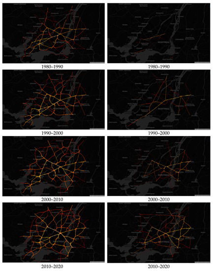 Next, we move to modeling citation networks and Figure 4 presents the geographic distribution of Montreal patent citations. The right column presents the citations of smart cleantech patents, while the left column presents citations in other fields.