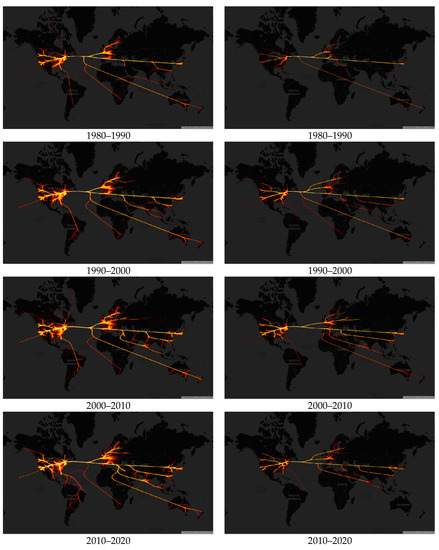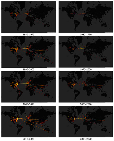 The network analysis is based on the graphs defined by edges and vertices. Throughout the analysis we define a vertex to be a geolocated patent inventor. USPTO database provides latitude and longitude for each inventor, which we convert to Mercator projection for visualization purposes. We follow the USPTO convention and each inventor is given a unique id based on their disambiguated name and patent id. Note that the same person can have multiple unique ids (and associated geographical locations) corresponding to the actual geographical locations where their patents were invented. For citation networks, an edge in the graph is created between every inventor of a given patent and every inventor of respective citing patents. In collaboration networks, for each patent, edges are created between all distinct pairs of inventors of this patent. If a patent has a single author this is counted as a single edge between the author and him/herself. The nodes are overlaid over the Mercator map projection according to their coordinates. The edges between nodes are represented by bundled edge curves that are computed by Hurter, Ersoy and Telea algorithm [78]. The purpose of edge bundling is to reveal the detailed substructure of the graph, which becomes visible after edge bundling. Data processing is accomplished on two HP ProLiant DL580 G7 servers, each equipped with four Intel Xeon E7-4870 2.4GHz 10-core processors and 256 GB of RAM. The data processing software stack includes Ubuntu 18.04, python, dask (parallel computation engine [79]) and HoloVis and Datashader (python visualization tools https://holoviz.org, accessed on 6 June 2021).