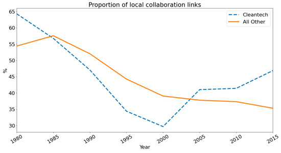 Figure 3 indicates that, while cleantech and other clusters had more local collaborations than global in the 1980s, over time, there was a downward trend and the share of international collaborations significantly increased. At the same time, the diagram indicates a special dynamic for cleantech as, while the share of local linkages dropped to 40% in 2000, after 2000 there is again an increase in local collaborations. This may be explained by the fact that since 2000 there has been a series of local policies aimed at growing the local cleantech cluster and invigorating local collaborations. For instance, the Écotech Quebec cluster association was launched that explicitly promoted and gave funding to projects with local collaborations (https://ecotechquebec.com/en/about-us/vision-mission-and-actions/ accessed on 6 June 2021). At present, half of Montreal’s co-inventor linkages in smart cleantech are local and half are international.