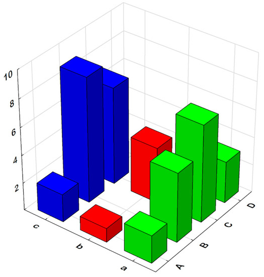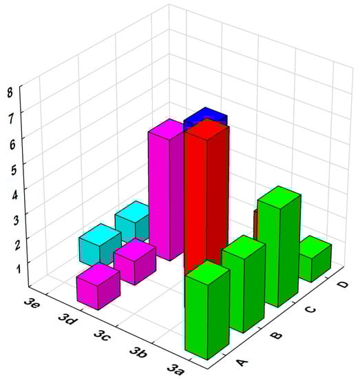 The relationship between the size of stores, their losses and the number. Explanatory note: X-axis—store size (A: up to 100 m2, B—101–200 m2, C—201–500 m2, D—larger); Y-axis—losses (a—up to 10%, b—10–20%, c—20–30%, d—30–40%, e—more); Z-axis—number of stores.