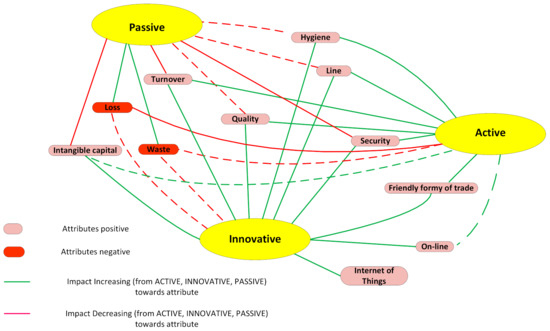 Taking into account the diverse behavior of the studied companies, the authors attempted to isolate the types of stores with different modes of adaptation activities during the COVID-19 pandemic, which situate their future position in the competitive market. They are presented in the form of an empirical model (Figure 3). Assuming that the success of the company occurs in the situation of the best adaptation of activities to the expected changes in the market of demand and supply, three types of adaptation were distinguished: (1) passive, (2) active and traditionally entrepreneurial, and (3) entrepreneurial—innovative. The first one is characterized by survival orientation, decreasing sales turnover and product structure, as well as increasing losses and wastage, meaning less care for quality and food safety. What is more, corporate capital management activities there are limited to ongoing hygiene activities to protect employees and customers from the effects of a pandemic. Thus, this type of store did not perform the food safety function satisfactorily. The second type of company is characterized by active activities in the management of intangible capital, in improving the qualifications of employees and their knowledge and skills through training, as well as the growth of such resources of social capital as trust, credibility and cooperation. It influences through its decisions to increase the quality of goods, does not reduce turnover, shapes non-traditional, more friendly forms of sales, albeit already being known in the market, and maintains the existing diversity of assortment. Food security is not threatened in this case. The third type of store is characterized by the highest degree of its realization, thanks to the entrepreneurial decisions of managers in the application of innovative technologies in serving consumers, the spread of online sales, the application of the internet of things (IoT) in storage (warehouses, cold stores, refrigerators), and through active measures in the development of human and social capital. The result is an increase in the size and structure of products on sale, while losses are decreasing and the quality of goods is not compromised. In the studied chain, this type of store still occurs in limited numbers.
