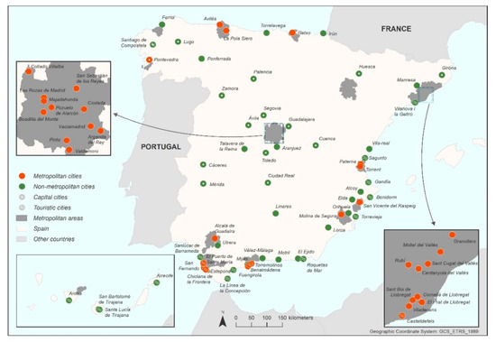 The 81 Spanish cities with between 50,000 and 100,000 inhabitants form a rather heterogeneous group (Table 1). Among these are seven cities declared World Heritage Sites by UNESCO (Santiago de Compostela, Segovia, Ávila, Toledo, Cuenca, Cáceres, and Mérida) and certain well-known tourist destinations on the Mediterranean coast (Estepona, Fuengirola, Benidorm) and Canary Islands (San Bartolomé de Tirajana). Some other cities are ‘metropolitan’, being located within any of the 12 main metropolitan areas in Spain. These 12 metropolitan areas of reference are: Madrid, Barcelona, Valencia, Seville, Bilbao, Malaga, Zaragoza, Murcia, Alicante, Santa Cruz de Tenerife, Vigo-Pontevedra, and Oviedo-Gijón. Both Table 1 and the map in Figure 1 indicate which non-metropolitan cities are the capital of a province and which are touristic in character.