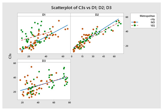 The correlation of the C3 index with the other two sub-indices indicates a warmer association with both D1, Cultural Vibrancy (R = 0.549), and D3, Enabling Environment (R = 0.541). However, non-metropolitan cities clearly have a much better relationship between the C3 index and D1 sub-index, so that for this group of cities it can be said that cultural vitality is most influential in the value of the C3 index. This result has also been observed in the larger European sample with respect to medium-sized cities with significant cultural heritage and consistent resources [1].