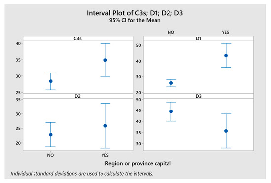 The difference observed in the cultural and creative behaviors of metropolitan and non-metropolitan cities confirms the hypothesis and the influence of the borrowed size effect on the dynamics of metropolitan cities, as well as the principle of centrality in non-metropolitan cities. Additionally, Figure 5 is in support of this principle and its influence on the behavior of non-metropolitan cities, showing the results of the contrast of means between the 15 non-metropolitan cities that are regional or provincial capitals and the remaining 66, with no administrative rank. The graph reveals that these capital cities perform better than the non-metropolitan group in general (the mean of the C3 index being higher), and especially in terms of Cultural Vitality (sub-index D1, ostensibly higher). They also perform better in Creative Economy (sub-index D2) compared to other non-metropolitan cities, although they fall short of the average values of metropolitan cities.