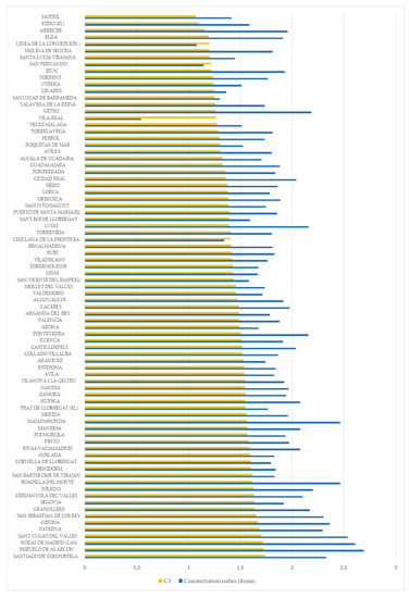 From here, the added value is calculated by groups of companies, assets, employment, and benefits. The quotient between benefits and assets measures the economic profitability of the companies in each group, and the relationship between the relative weight of each group in each of the variables compared to the weight it represents in terms of population results in the concentration index. The ordering of companies by quartiles is repeated for each of the sub-indices that make up the C3 index. Table 4 and Table 5 offer a synthesis of the main results obtained from this analysis.