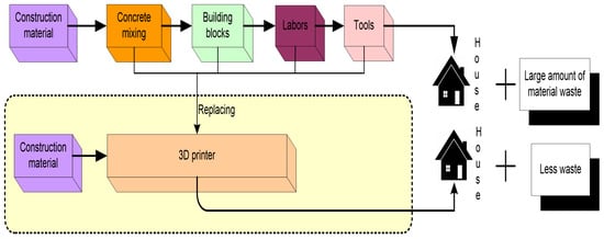 Globally, the impact of the construction industry on the environment is very high in terms of energy consumption, waste generation and emissions of greenhouse gases [71]. Currently, society is aiming to find sustainable technologies which can reduce the burdens of traditional construction approaches. 3D printing has emerged as a sustainable technique for this purpose. More innovations will bring this technology into the mainstream of buildings formation and construction processes [72]. Through this technology, the additive construction strategies facilitate topology optimization, reduce the use of materials, produce complex geometries without supporting structures and, more importantly, accumulate and integrate complex technologies in a single platform. This practice is not possible in traditional construction mechanisms [73]. Customization is achieved in complex structures by computer-aided design and improved fabrication processes. The construction complexes have been possible through digital technologies and improved material science [74]. The industries involved in building construction are moving towards digitization and adopting the 3D printing technology to convert the virtual model into an accurate model. Productivity has been increased with a reduction in operating cost by this technology for building construction [53,75].