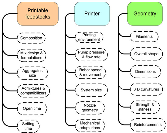 Figure 3 presents the significant interdependency of multiple parameters of 3DP for construction. To effectively enforce 3DP in a large-scale structure, the following are three primary parameters to be discussed.