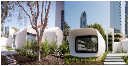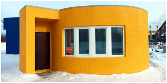 Similarly, on-site construction of the “Apis Cor house” in Russia represents a remarkable achievement for this technology, and its ability to push the boundaries beyond expectation (Figure 6). This building was made in 24 h with an estimated cost of USD 10,000, which is far cheaper than the traditional methods of housing construction.