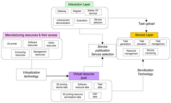 The physical layer comprises the manufacturing resources, access, and virtualization, while the service layer operates in a similar context as the control layer, core layer, and task layer. At the same time, several architectures on the 3D cloud Printing Platform consider virtual resource layers as the core components of virtual resource pools for multiple homogenous nodes. The service aggregation layer permits the configuration of service and internal calls for virtual resource pools while delivering lifecycle resources, including workflows. In another architecture, all physical and interface devices are differentiated on distinct levels. The user tool layer is assigned as part of the service layer’s functionality [77]. In [78] an agent layer to the architecture establishes a bridge between the resource demand side and the supplier. The agent layer contains the supplier of the cloud output and the demand side of the operation, the system operating connection as shown in Figure 8. A service integration architecture was developed to complete service integration [79] and it includes a physical system layer, adapter layer, service layer, control layer, and application layer. The architecture is only for the convergence of services, and the first four layers include the virtualization, servitization, and control of manufacturing infrastructure and fulfil the resource layout and compete. On the other hand, the architecture of 3DP OS [80] and 3D framework [81] for manufacturing tools have been built based on IoT and presented; namely, the resource layer, perception layer, network layer, service layer, and application layer. Furthermore, several researchers have suggested the architecture of the associated service models in the field of training [82] conventional valve manufacture [83] miniature manufacturing [84] and other areas.