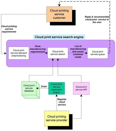 Figure 9 provides the detailed mechanism of the cloud printing service system. Cloud printing service customers and cloud printing service providers are represented as the users in this system [85]. Cloud printing service customers request the printing of a model by providing the printing requirements. The request is sent to the cloud print service search engine for pre-processing and the details are sent to the cloud print service search to initiate the printing [86]. The cloud service provider delivers a database, application interface (API), and registration support for utilizing the services. Here, the cloud print search sends the request to the database and API, where it receives a message for continuing the process further on in the system. The cloud service queue refers to an order or line of these tasks that are waiting to be handled.