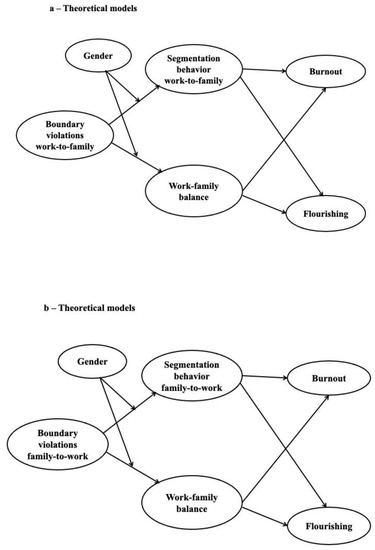 The frequent interruptions to which employees in this situation are subject, both from work to family and in the opposite direction, are one of the factors that may contribute negatively to their well-being, as boundary violations are defined as “an individual’s perception that a behavior, event or episode either breaches or neglects an important facet of the desired work–home boundary” ([8], p. 713). In fact, the literature has highlighted that boundary violations have a negative impact on individuals [9,10]. In a situation of teleworking while in lockdown, which, as already mentioned, forced families to perform their work in the same space at the same time while simultaneously having to manage the demands of family and domestic life, these violations may have been more intense. To better understand this phenomenon, this study seeks to explore the different mechanisms that may shed further light upon the relationship between boundary violations and well-being. Segmentation behaviors, both from work to family and from family to work, are one of these mechanisms, as explained by the boundary theory [11,12] and work–family border theory [13]. More specifically, individuals establish boundaries that may vary from segmentation (work and family separated) to integration (work and family combined) [12,14,15], and the literature has pointed to segmentation behavior as being related to better employee outcomes than integration behavior [15,16,17,18]. Thus, the second aim of this study is to explore the potential mediating role segmentation behavior (from work to family and from family to work) may have in the relationship between violations and well-being (i.e., burnout and flourishing). Furthermore, previous research has shown that work–family balance is related to positive outcomes, such as less exhaustion in a context of lockdown and working from home, similar to the setting of this study [19]. Therefore, it is equally relevant to include in this second aim an exploration of the role that work–family balance, defined as “the extent to which an individual’s effectiveness and satisfaction in work and family roles are compatible with the individual’s life role priorities at a given point in time” [20], may have in the aforementioned relationship.