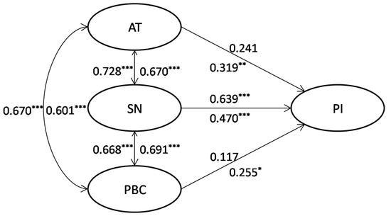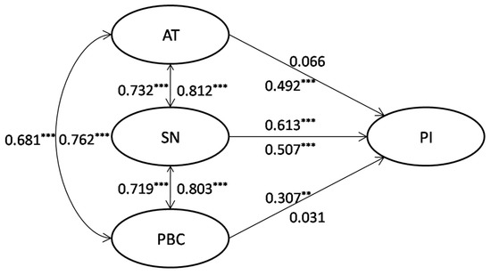 The Cronbach’s α coefficient of attitude, subjective norms, perceived behavioral control, and purchase intention were 0.838, 0.811, 0.896, and 0.902, respectively. It confirmed that the questionnaire had good internal consistency. The result showed that the Kaiser-Meyer-Olkin value was 0.939 > 0.80, and the Bartlett’s Test of Sphericity was significant. This result indicated that the data had good structure validity and was suitable for factor analysis.