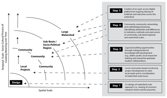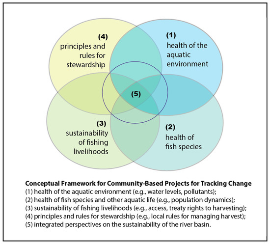 Inter-program planning and implementation of community-based monitoring create opportunities to think about how different monitoring activities in different places are interconnected [44]. However, much more attention in monitoring design has been paid to questions of theme and tactic, with lesser consideration of scalar questions of synthesis and meaning. Balancing the necessity of tracking finer-scale changes that have meaning and significance to local and Indigenous peoples while at the same time building knowledge about larger-scale ecological phenomena is important. It is among the greatest challenges facing those living in and governing large watersheds, and more challenging still, given that ecological and social change are interrelated [32,33]. Changes occurring within the aquatic system can have different meanings and significance depending on the perspective of the individual or social group. What is meaningful to one community may seem insignificant to another. In addition, shifts in biophysical conditions can have reverberating impacts on the social, economic, and cultural well-being of individuals and communities dependent on basin resources [32]. Few monitoring programs have considered the interrelated nature of ecological and social change [33,45,46,47] and considered the opportunities that can come from bringing together diverse methods and knowledge systems, including those developed by Indigenous peoples [32,48].