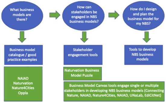 Three types of tools have emerged covering the following aspects (see Figure 3): (1) business model catalogues and examples of good practices to address lack of knowledge and raise awareness of the multiple forms of NBS business models, (2) interactive approaches engaging stakeholders in the co-design of business models, and (3) support tools offering more granular approaches to designing and planning business models for NBS, often applied in collaboration with stakeholders using the other methods.