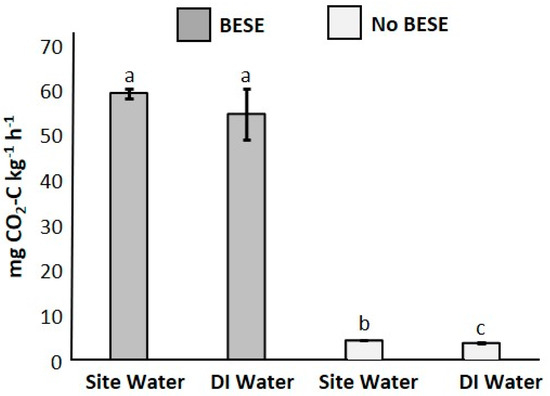 The elemental composition of BESE was calculated as mean ± standard error (n = 5). All statistical analyses described for this study were performed in R (version 4.0.1) using R Studio (version 1.3.959) with an alpha value of 0.05. The respiration data were tested for the parametric assumptions of normality using the Shapiro–Wilk test and for homogeneity of variance using Levene’s test. The data violated both assumptions, even after a number of data transformations were attempted. Therefore, the untransformed data were tested for significance using the nonparametric Kruskal–Wallis test, which does not require normality or homogeneity of variances. In addition to overall comparisons, pairwise comparisons across the two water sources and with and without the presence of the BESE material were preformed to determine the robustness of these overall results.