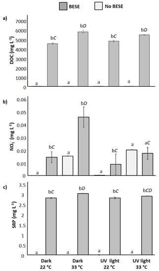 Final concentrations (mean ± standard error) of surface water nutrients following 5 weeks of incubation with (BESE) or without (No BESE) fragmented BESE for (a) dissolved organic carbon (DOC), (b) nitrate + nitrite (NO3−), and (c) soluble reactive phosphorous (SRP). For all data, n = 5. Different lower-case letters represent differences (p < 0.05) between BESE and No BESE treatments; different upper-case italic letters represent differences (p < 0.05) among BESE treatments exposed to different experimental conditions; all pairwise comparisons were based on Tukey HSD post hoc tests.