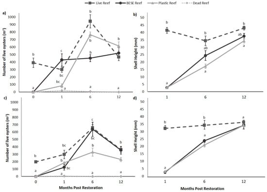 Oyster monitoring metrics for Northern (a,b) and Southern (c,d) BACI reefs. Values represent mean ± standard error; n = 5. Different letters represent differences (p < 0.05) between treatments (reef type) across both regions (Northern and Southern) based on Tukey HSD post hoc tests. Dead reef shell heights not shown as all values were zero.