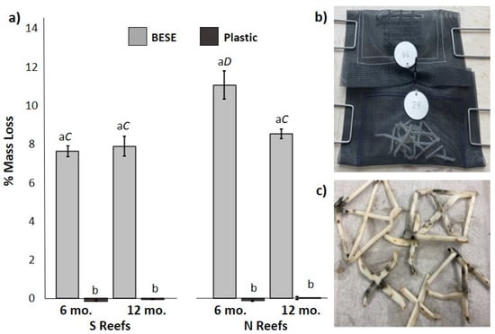 Field mass loss (%) of coarsely fragmented BESE or plastic (mean ± standard error; n = 5) after 6 and 12 months of deployment on live oyster reefs in the southern (S) or northern (N) region of Mosquito Lagoon (a). Different lower-case letters represent differences (p < 0.05) between BESE and No BESE treatments; different upper-case italic letters represent differences (p < 0.05) among BESE treatments exposed to different experimental conditions; all pairwise comparisons were based on Tukey HSD post hoc tests. Appearance of litter bags pre-deployment (b) and of BESE following retrieval (c) also shown.