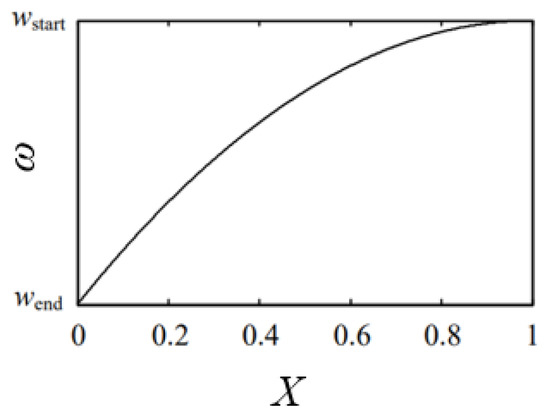 Figure 3. Inertia weight.At time t, the distance between particle i and the optimal particle of the population can be calculated by the following formula:In the formula: D is the dimension of the particle search space; is the value of of particle i at time t; and represent the initial and final values of , respectively; and , respectively represent the upper and lower limits of the particle’s flight position. - Crossover mutation. To improve the diversity of the particle population, this paper uses the cross-mutation operation in the genetic algorithm to update the position vector of the particle. The specific operation steps are as follows: