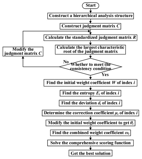 The analytic hierarchy process-entropy method is used to calculate the subjective and objective comprehensive weights of indicators, and comprehensively score each scheme. To show the combined evaluation method used in this article more clearly, we have made a flowchart of the method shown in Figure 4. It can be seen from the figure that the combined evaluation method is based on the combination of analytic hierarchy process and entropy method. First, the analytic hierarchy process is used to calculate the subjective weight of the indicator, and then, the entropy weight method is used to calculate the objective weight of the indicator. Finally, the entropy weight method is used to modify the analytic hierarchy process to obtain the combined weight coefficient. The entropy weight method is used to modify the analytic hierarchy process to obtain the combined weight coefficient. This method mainly starts from the actual project, realizes the on-site project requirements with the analytic hierarchy process, and uses the entropy weight method to modify it, so as to avoid the index weight being too subjective. In the next study, we consider introducing intelligent algorithms into the calculation of indicator weights to improve the comprehensive performance of indicator weights.
